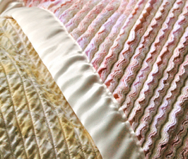 This baby blanket is the ultimate in cuddly softness. One side features cotton flannel and the other side furry and soft minky. The blanket is bordered with a ruffled satin trim. Sizing is made to your specifications. Blankets are available in three sizes.