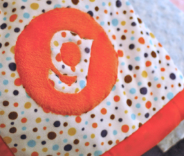 On this blanket, baby’s initials are featured in the center of a color coordinating circle of softness. The blanket is double-sided, one side featuring cotton flannel and the other side furry, soft minky. The blanket is bordered with a satin trim in a coordinating color. Sizing is made to your specifications. Blankets are available in three sizes.